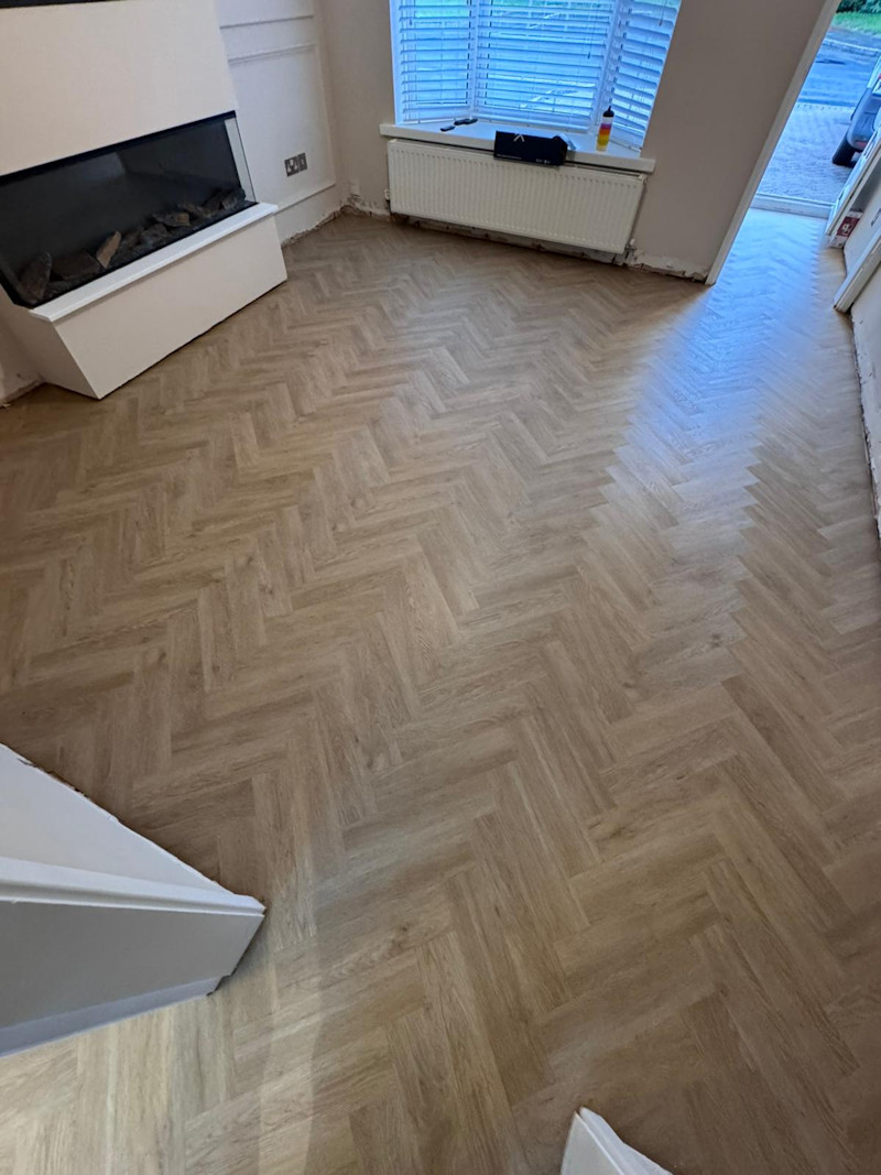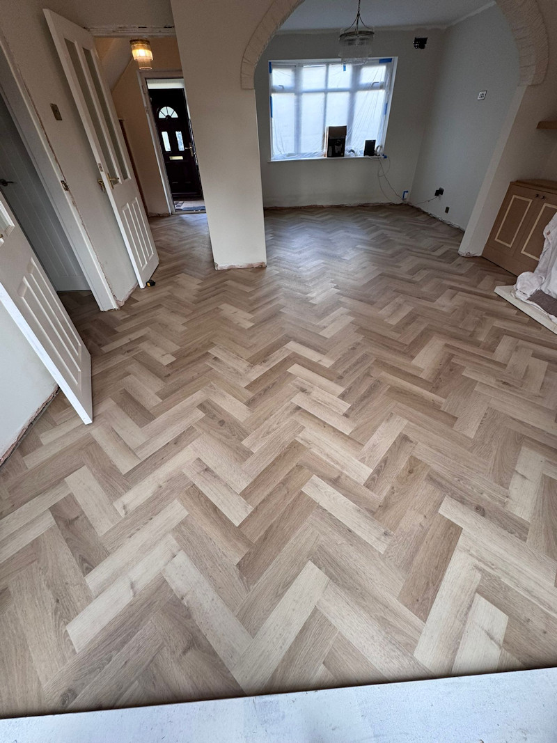 Once this had set, we then fitted the luxury vinyl tiles. This type of flooring is ideal for use in a range of rooms because it is functional and practical so it can cope with the rough and tumble of family life, with muddy boots in the hall, and with flood spillages in the kitchen. Our clients chose Invictus Maximus Parquet laid in a herringbone pattern without a border. You can see what this looks like from the photographs included.